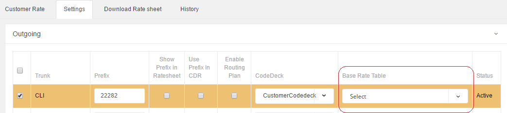Where we attach new rate sheet to a customer trunk? Created :Fri,12,2016 Last Updated:Tue,11,2022 Please go to Accounts. Click on Yellow button (Customer). Below screen will pop up. Click on Settings tab and select Base Rate Table.