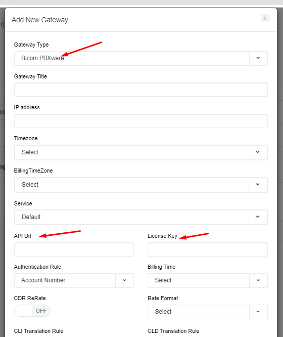 In order to enable integration with Bicom PBXware go to Integration -> Billing Gateway -> Bicom PBXware
