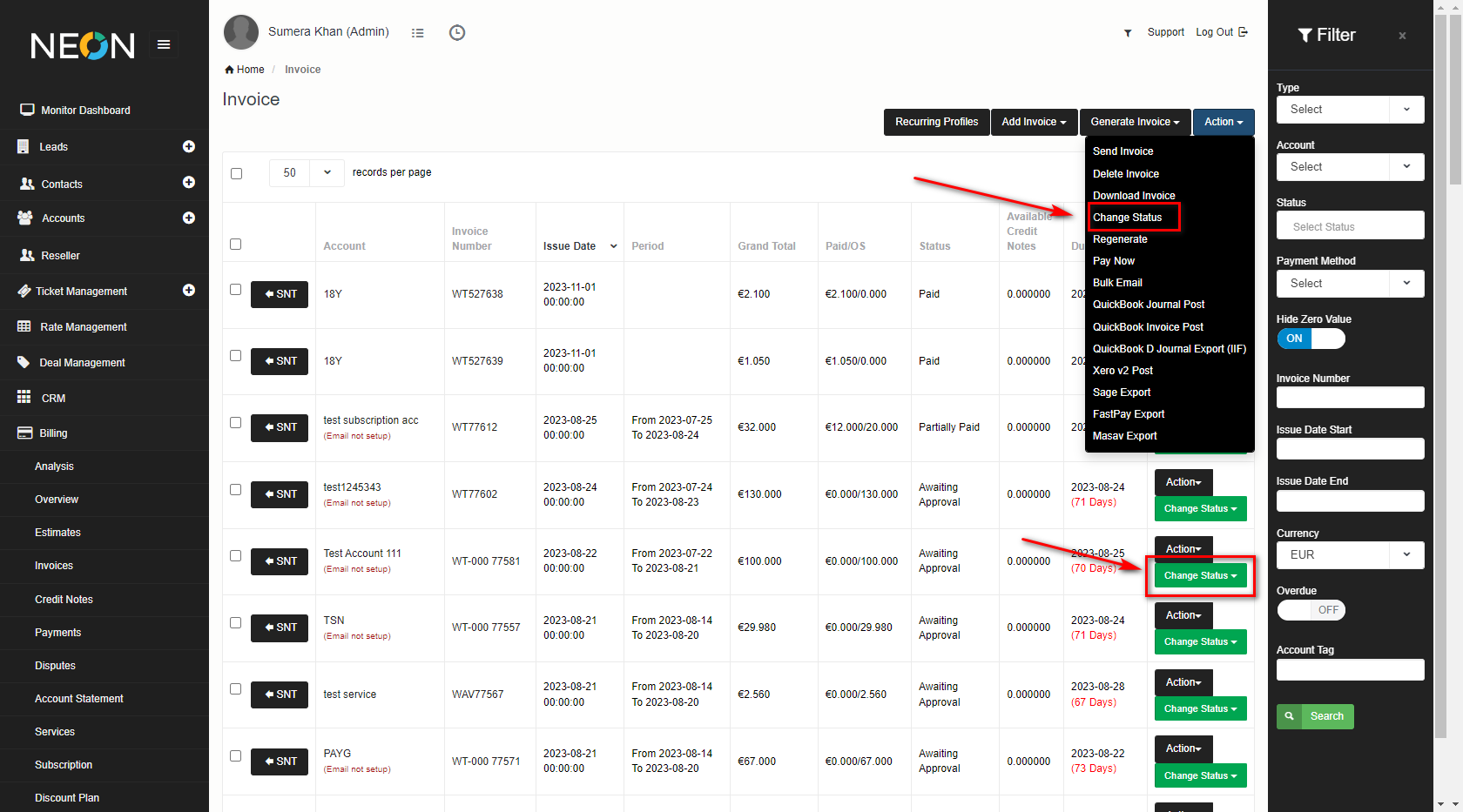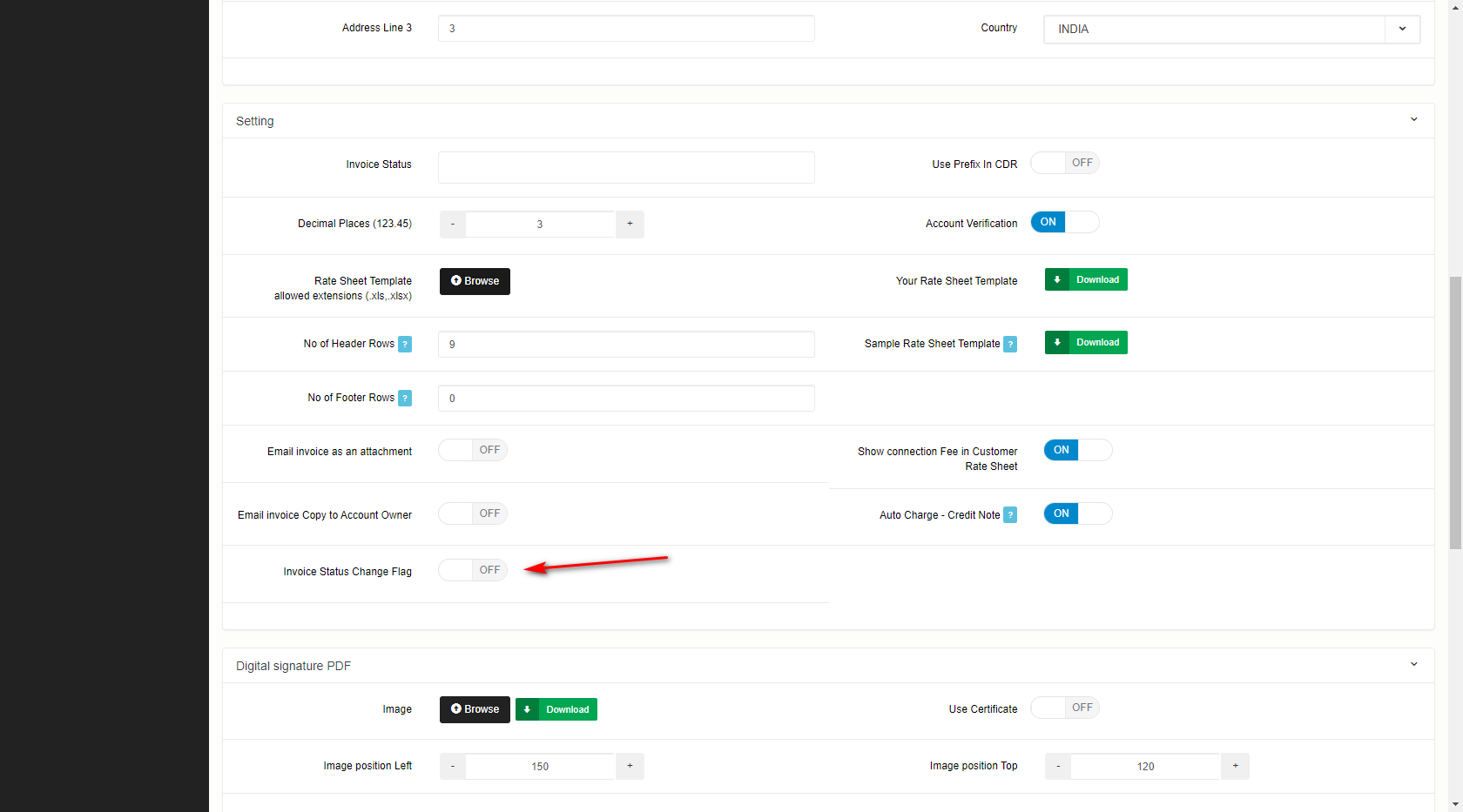 You can ON and Off Invoice Status Change Flag button in Company Page under setting panel. By default it will be off.