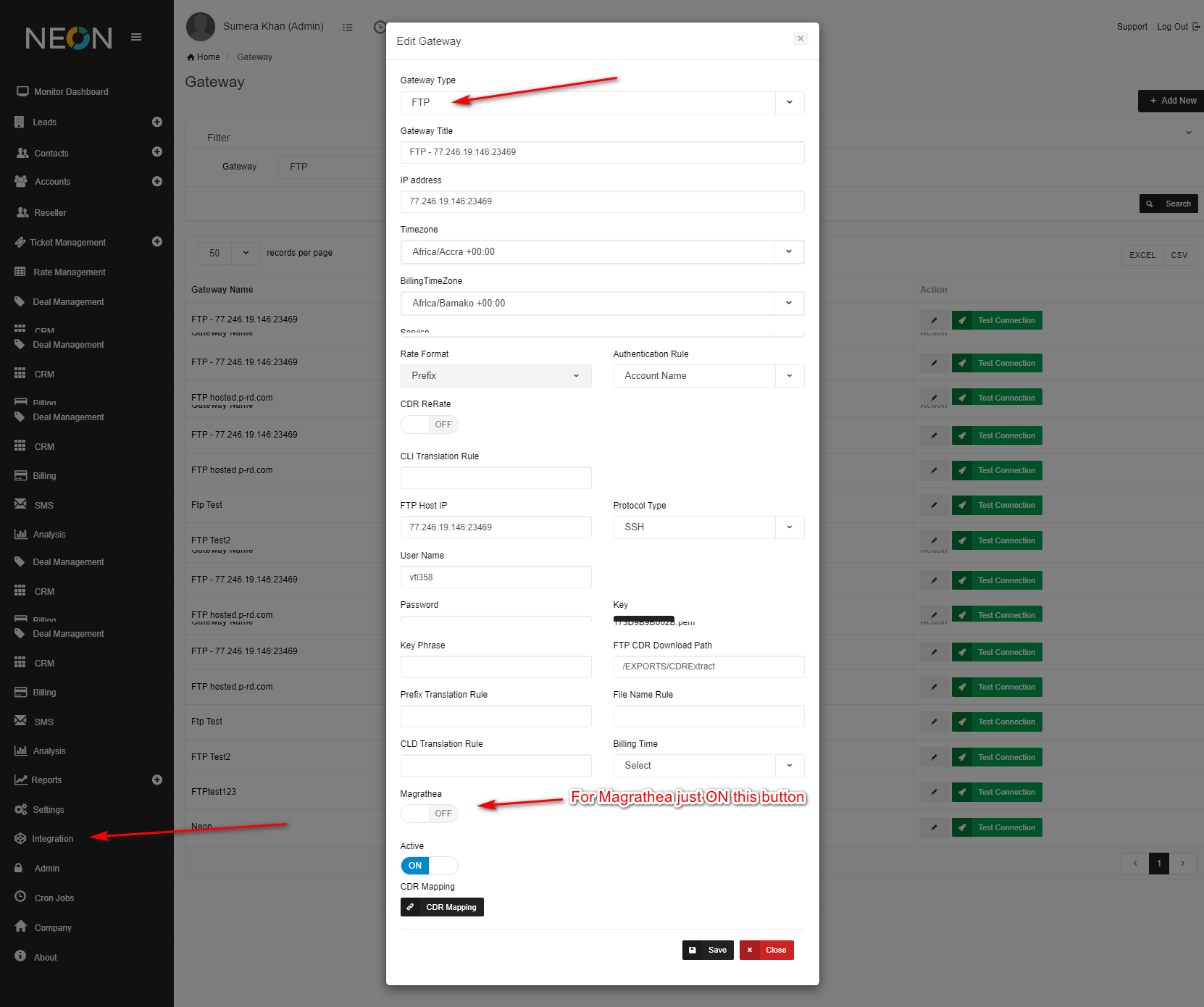We are using FTP integration as Magrathea integration, first we will setup FTP integration like same before, FTP mapping etc. So for Magrathea we will ON the button in gateway form otherwise we will set OFF.