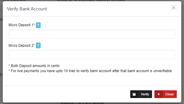 In order to verify the account click on Verify button and enter micro deposits value (in cents). Just so you know, there is a limit of 3 failed verification attempts per bank account, after which the bank account will no longer be able to be verified.