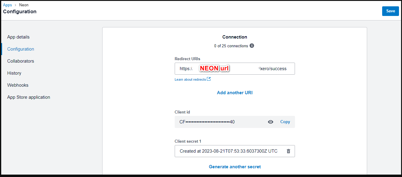 For the NEON integration go to NEON->integration->accounting->XeroV2, add the details and save
